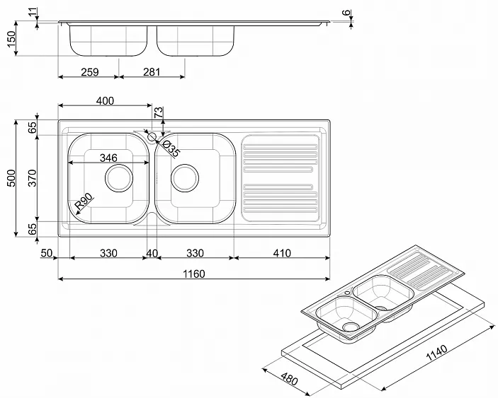 | Размеры выреза | 1140х480 мм |
