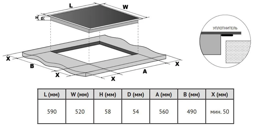 | Размеры встраивания, (ВхШхГ) | 30x560х490 мм |
